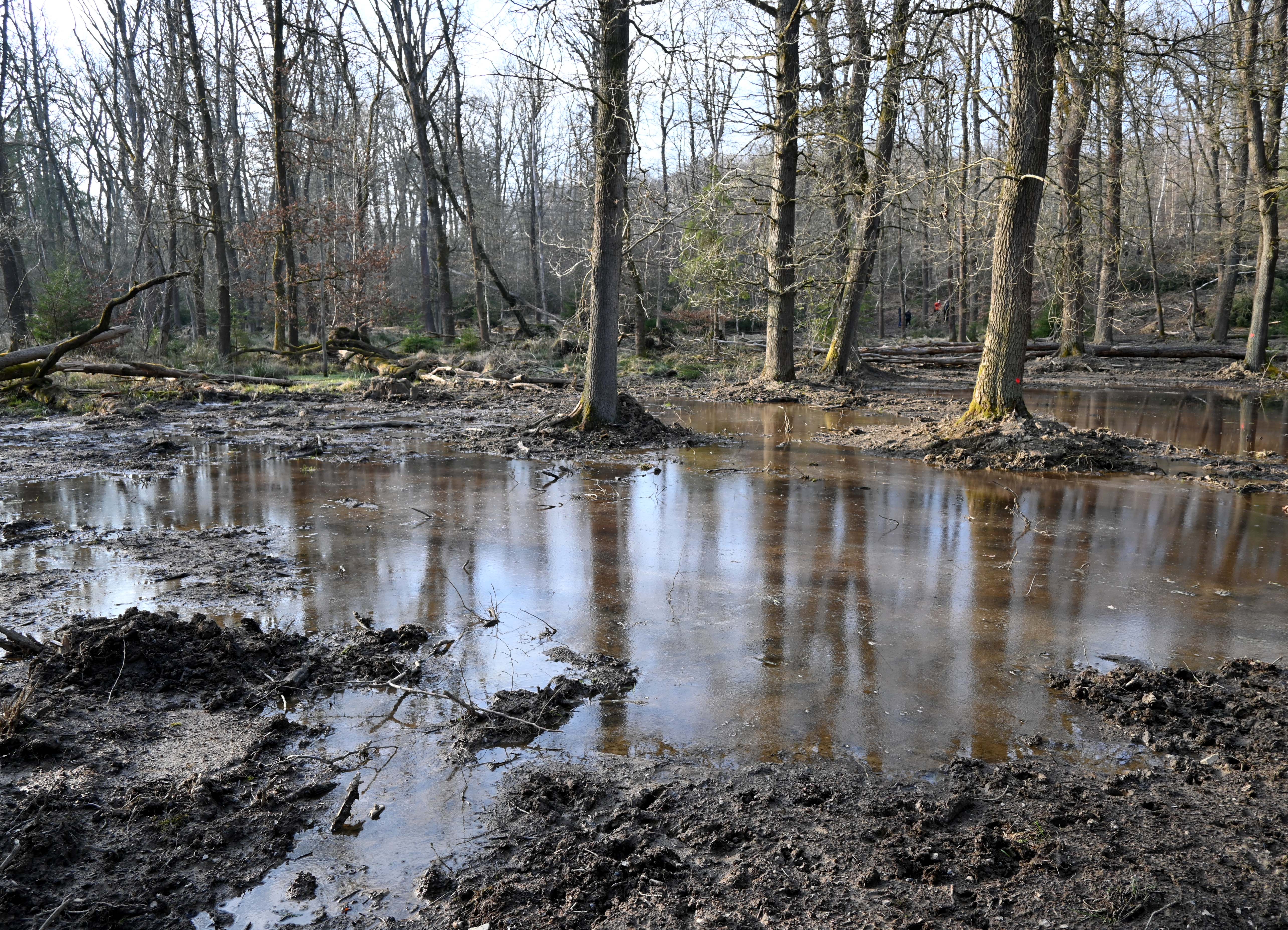 Allerdings ist der Wald durchzogen von künstlich angelegten Entwässerungsstrukturen. Alleine auf dem Gebiet des Kreises Soest sind es mehr als 1.000 Kilometer – neben Entwässerungsgräben auch Spurgleise, Wegeseitengräben und Bachbegradigungen. Sie waren seinerzeit angelegt worden, um das Wasser möglichst schnell wieder abzuführen und den Waldboden trockenzulegen. Auf diese Weise konnten Baumarten wie Fichten, die auf feuchten Standorten nicht gut gedeihen, in Monokulturen angepflanzt, geerntet und verkauft werden.